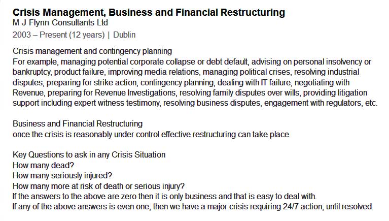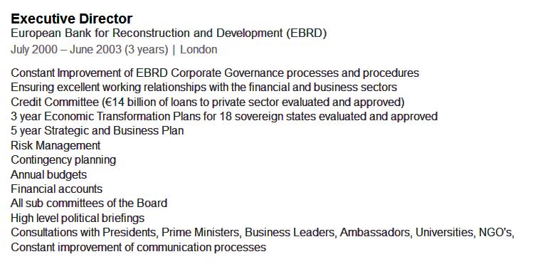 Details of Mike's time at EBRD from: Mike Flynn Company Website Terms of Reference Appointed to the Board to represent, and vote on behalf of the Governments of Ireland, Denmark, Lithuania and the FYR Macedonia. Work Schedule Full time position based in London with regular Board Consultation visits to the countries of operation to meet with local business people, Ambassadors and Governments to discuss issues and local developments (business and political). Full Board and sub committee meetings were held every two weeks. At these meetings loans were evaluated and approved and the basic Governance Business of the Bank conducted. During my three year term I attended every Board meeting and was involved in the evaluation and approval of €14 billion of loans and investment. The governance of such a large institution with such a difficult mandate, extensive geographical and political reach was quite complex and difficult to explain in a short note such as this. The bank has 59 sovereign states as shareholders, with most of the world's most influential NGO's in constant communication with the Bank, so the governance structures and the operations had to be in line with international best practice. In fact, as a Board, we were often dealing with issues involving intricate and inter related political, business, environmental, human rights and democratic that we were writing the rule book as we went. For example Meeting the political representatives of minority groups who had recently been involved in armed conflict with government forces. Deciding whether to hold the Banks AGM in a country where conflicting information was being presented about human rights abuses, delayed economic reform, allegations of political corruption, high level intelligence about potential terrorist threat to kill foreigners, etc. Staff of foreign investors being kidnapped by criminal gangs. Ongoing allegations of political interference and corruption while trying desperately to structure loans to businesses and create jobs. Meeting with reforming Prime Ministers and their teams, to discuss economic reform and understand the difficulties they were experiencing. Then being advised of one being assassinated and deciding whether to advise on more or less radical reforms. Engaging with the Chairmen of Central Banks to discuss currency flight and how to deal with it without adversely impacting on FDI and international trade. Regular engagement with NGO's to understand local issues and to take their concerns into consideration when evaluation investments and the conditionality to attach. Reviewing every loan from not only a credit viewpoint, business perspective but also from a sustainability viewpoint, likely demonstration impact and whether it will assist democratic reform. Writing Regional and country plans for economic etc. reform that were consistent with the plans of the Government, WHO, World Bank, IMF, EIB, EC and other interested parties. Pre EBRD experience from: Linkedin