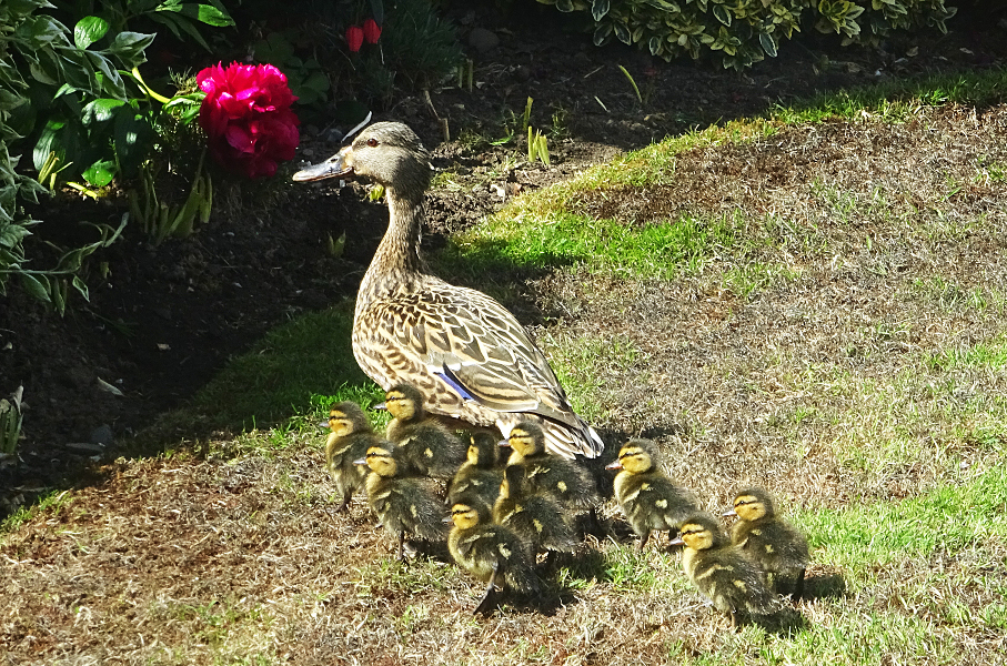 Enough of the rough stuff. A neighbour called me one day recently to have a look in her back garden. To her surprise, earlier in the day this duck with is clatter of ducklings paraded out from the garden bushes.