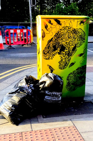 Dublin Canvas has been doing a great job around the city getting the grey traffic light control boxes tarted up. This one looked particularly appropriate on a rubbish collection evening.