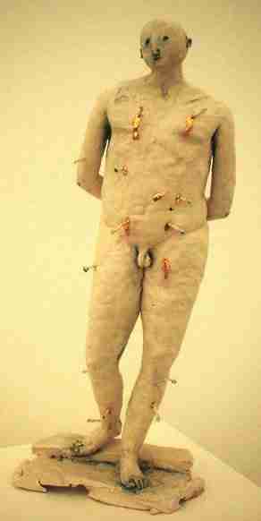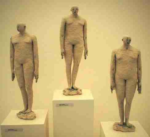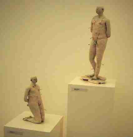 2001 Eisteddfod's gold medal in craft and design The 2001 Eisteddfod's Visual Arts and Crafts exhibition, containing a selection of work chosen from over 2,000 individual works submitted by over 400 artists, is rightly described by the selectors as "a strange, many-headed beast". The Chairperson of the Arts and Crafts Committee expressed a wish, and a hope, that the exhibition would be a "topic of discussion on the Eisteddfod field, nationally throughout Wales and further afield on the international level". It was certainly a hot topic on the field. Claire Curneen's exhibit won the gold medal in craft and design and a cash award of £3,000. Claire is now Cardiff-based but originally hails from Tralee. Her entry was a series of primitive style ceramic figures worked in porcelain with thin slivers of clay and gilt. This was a work of intensity and you either hated or loved it. I started off hating it from the catalogue pictures, but after visiting the exhibition the figures started to grow on me. There was a starkness and line to them that suggested a tentative serenity and the way in which the figures were grouped gave them a powerful sense of form.