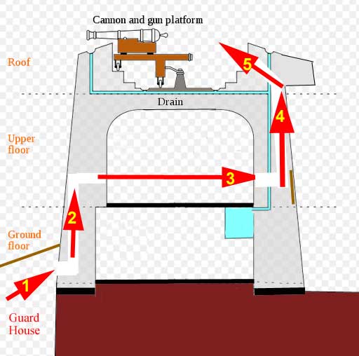 Cannon enters cavity in wall at ground level (1), raised to first floor level (2), swung to opposite side of tower at first floor level (3), raised to level of crown in wall cavity (4), exit to crown (5).