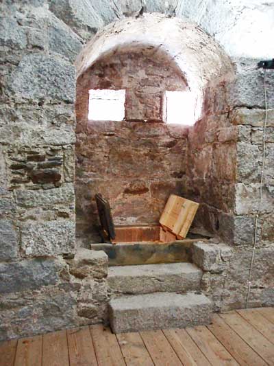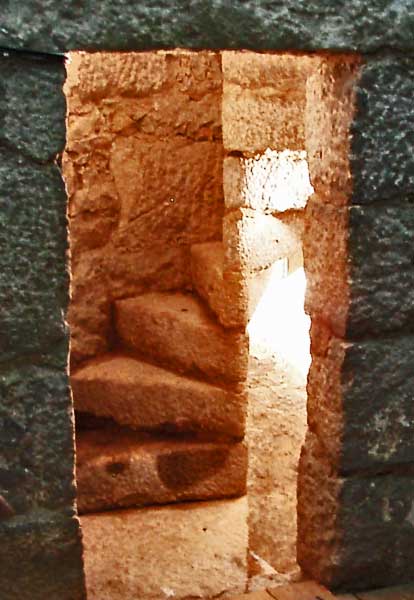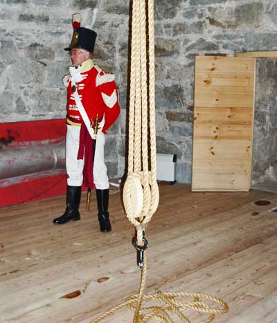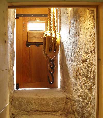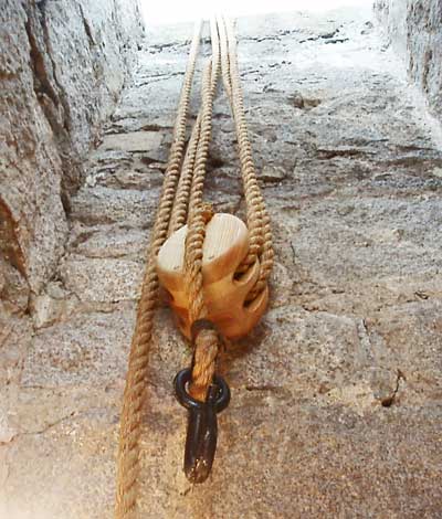 It's quite clear that the narrow spiral staircase in the wall of the tower is just about wide enough for a person to go up it. So how is all the necessary equipment and even the two and a half ton cannon got to the crown of the tower. Well, there's more than a spiral staircase in them there walls. Cavity passages in the wall and a set of block and tackle do the trick as illustrated below.