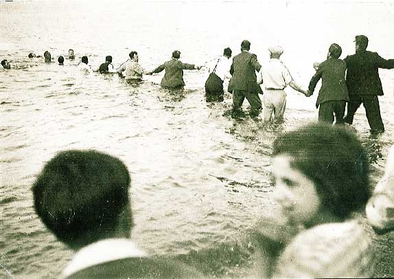 An annotation on the back of this picture suggests it was taken on 4 August 1937. It shows a chain of rescuers linking out to rescue someone from the sea.