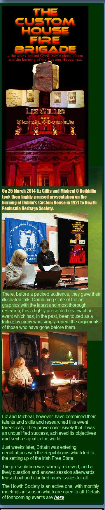 The item below is self explanatory. It is taken from Kilmainham Tales. It is presented here because the illustrated talk is fascinating and if it ever comes your way, go to it. Also, the two pictures of Míchéal and Liz were taken by myself with my new camera.