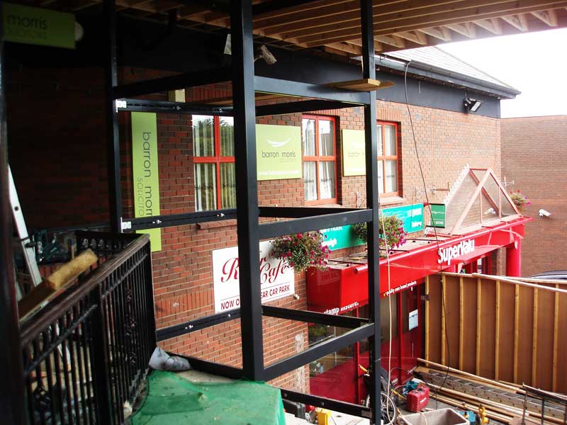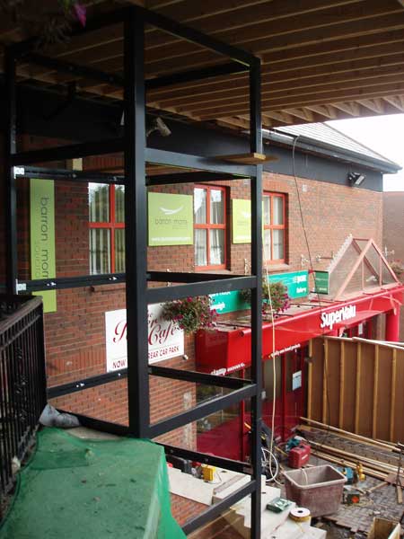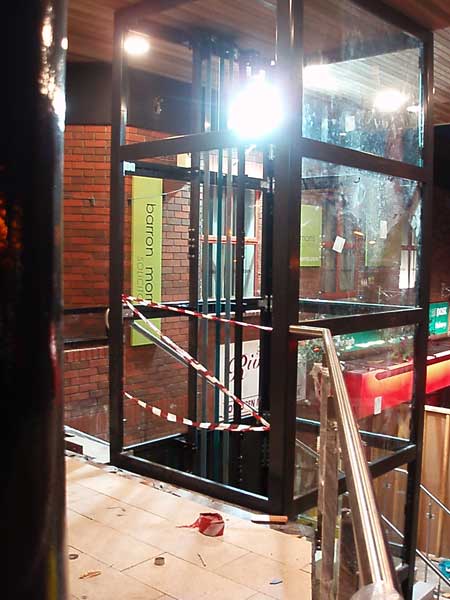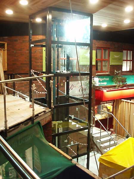 Further progress as the outer glass is installed in the liftshaft. The old railings has now been removed and the new one in place. The guts of the lift itself are installed and used as a dumb waiter platform.