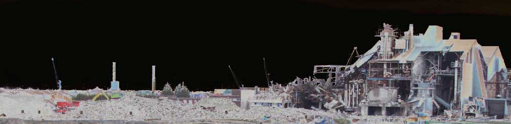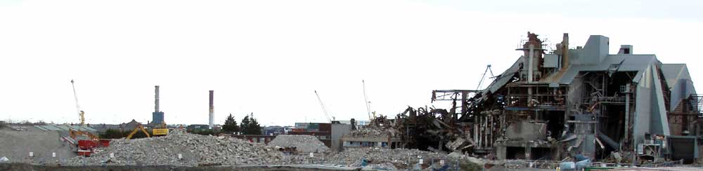 The only remaining building on this vaste and vacant site is a single stack which looks like something out of a Mad Max movie.