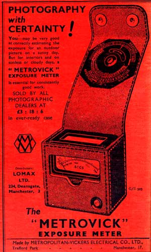 And, finally, on the back cover, the ubiquitous light meter. These could be quite bulky. This one cost £3/18/6d. Note the circular calculator built into the lid. Once adjusted for the meter reading this showed a range of compatible shutter speed and aperture settings.