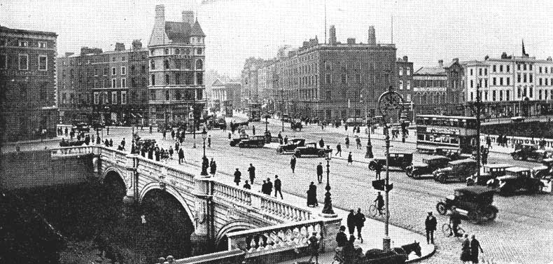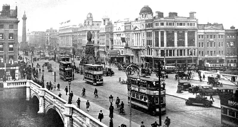 There are a number of things worth noting in this picture. There are trams rather than busses and the terminus for most of these was at the Pillar. As far as the Pillar itself is concerned, the railings at the top is the waist high version. It was many years later that the whole top platform was caged in after a number of suicides from the top. The controversial Farrell Canopy over the cinema entrance, on the right hand side, four doors up from the bridge, is still in place. The cars look ancient and there is not a lot of traffic. The shot looks like it was taken from the Ballast Office.